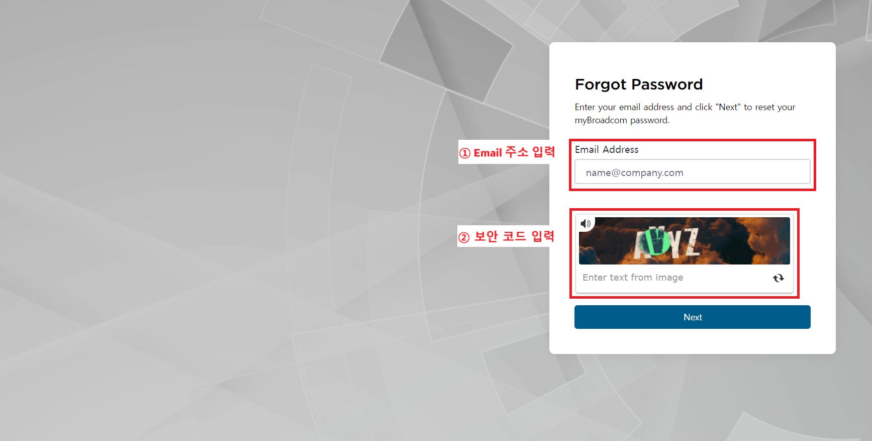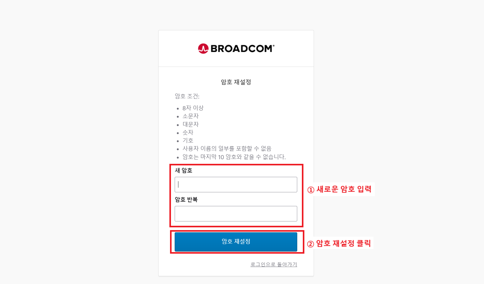 고객 또는 파트너가 Broadcom Support Portal의 계정 비밀번호를 초기화하는 방법을 나타낸 가이드 문서이다.