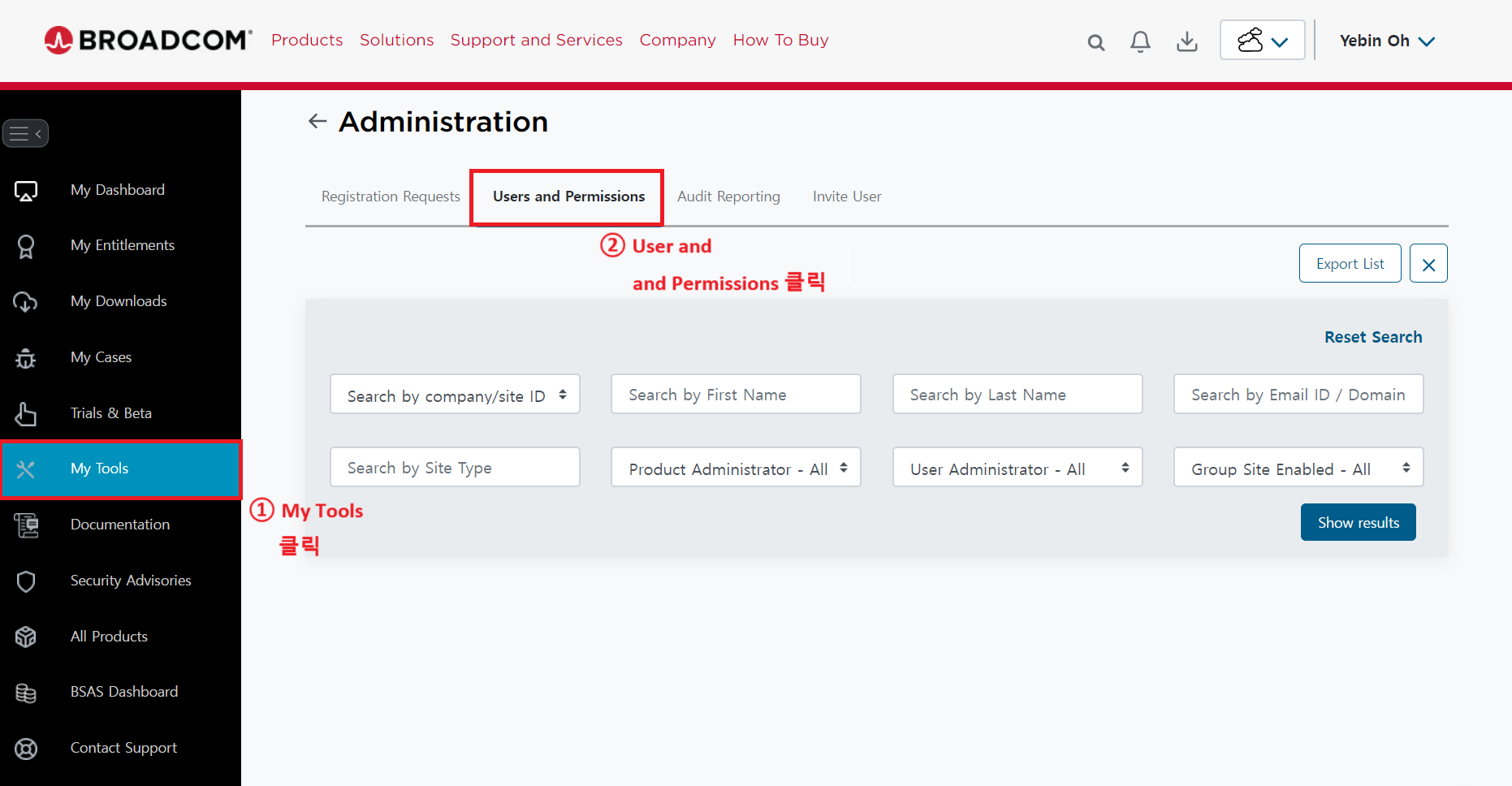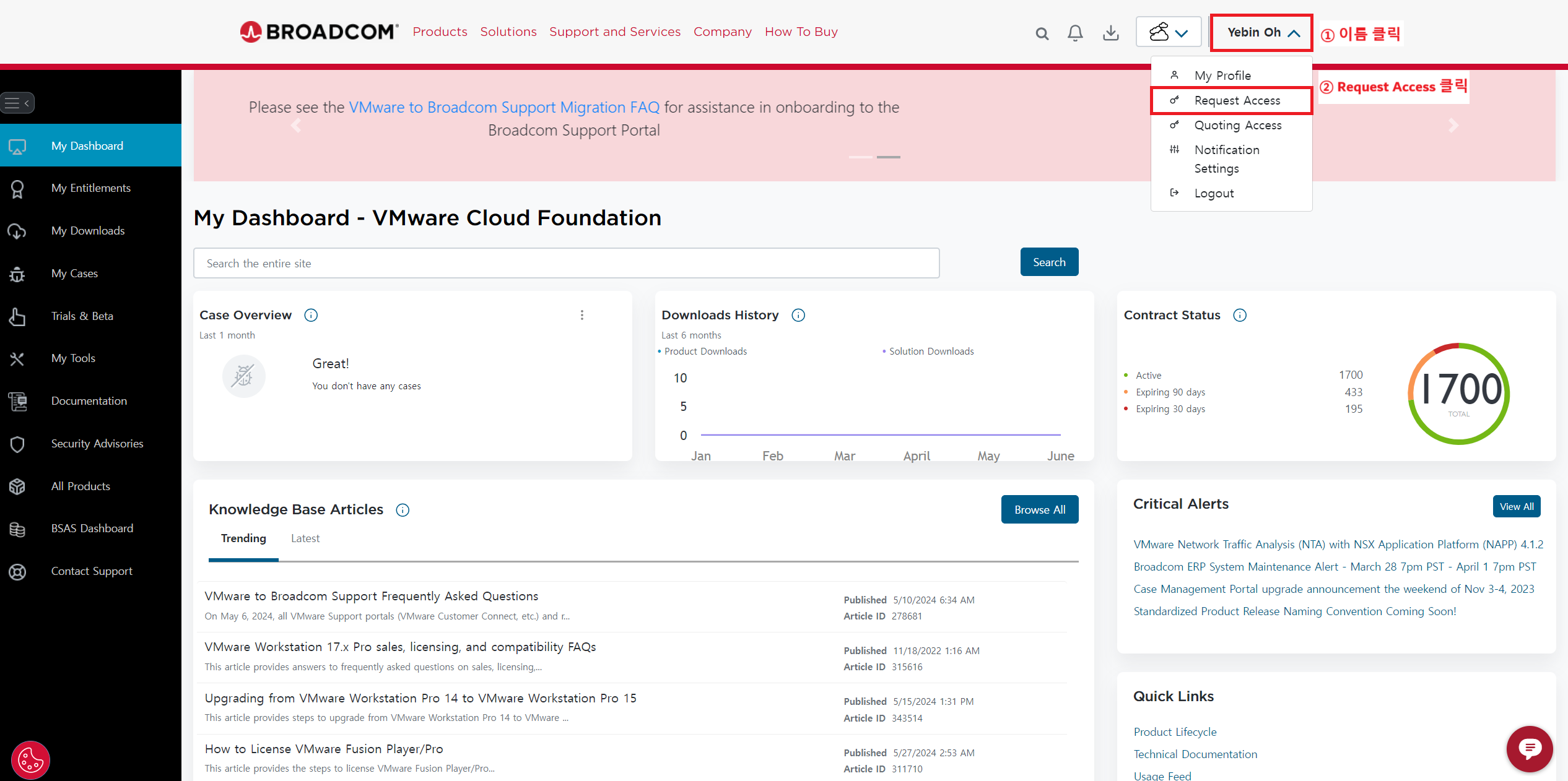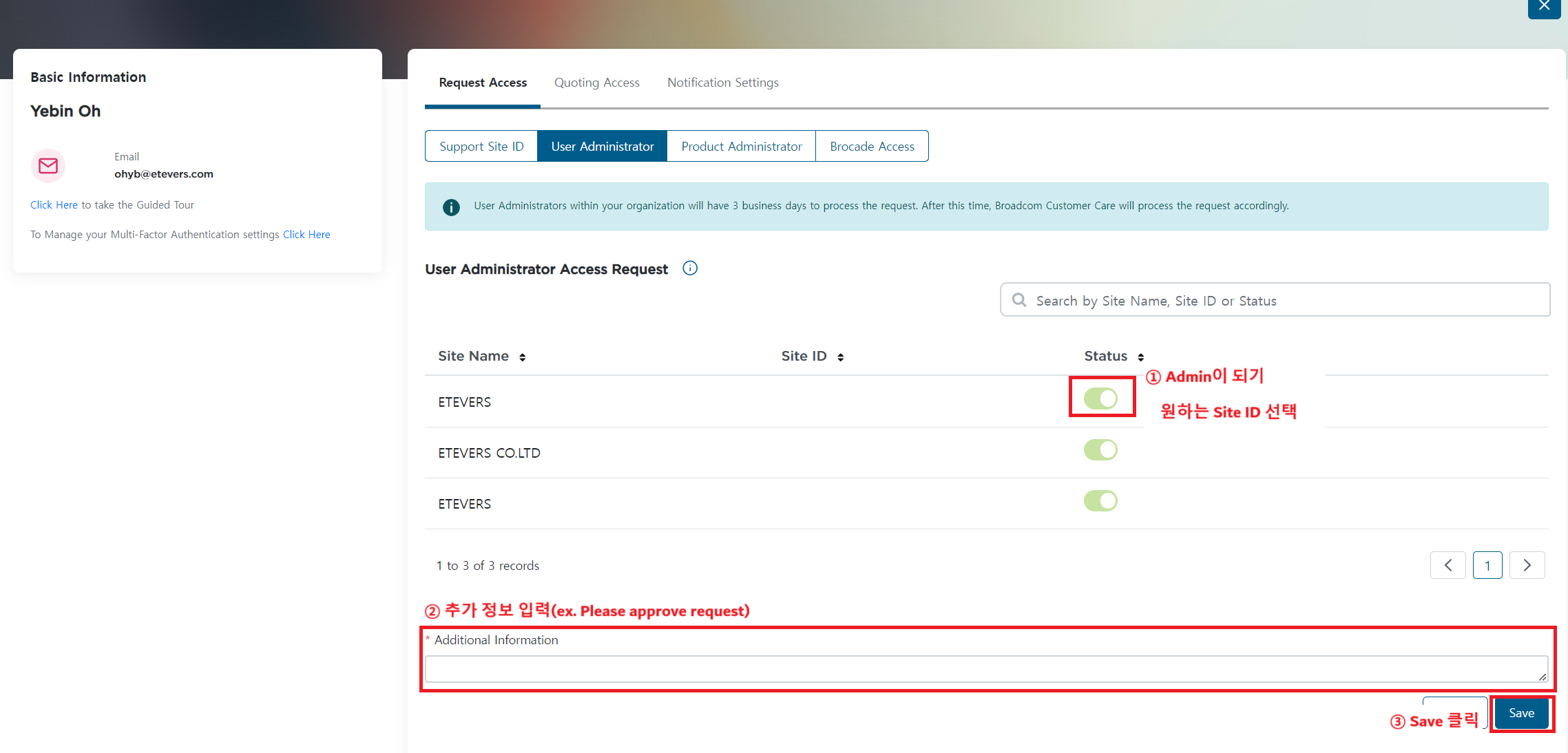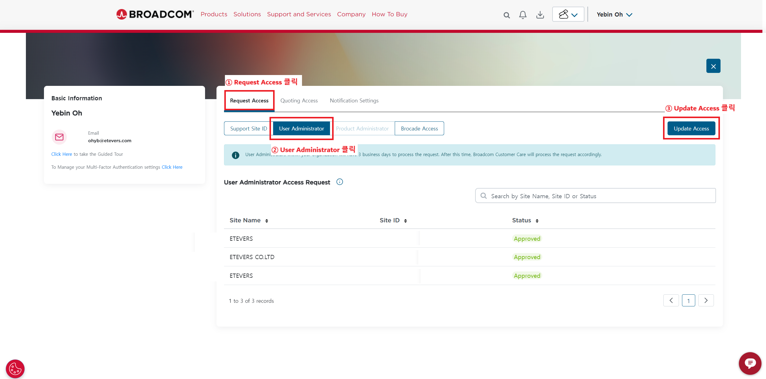 고객 또는 파트너가 Broadcom Support Portal에서 Admin 권한을 요청하는 방법을 담은 가이드 문서이다.